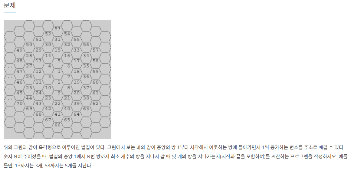 위의 그림과 같이 육각형으로 이루어진 벌집이 있다. 그림에서 보는 바와 같이 중앙의 방 1부터 시작해서 이웃하는 방에 돌아가면서 1씩 증가하는 번호를 주소로 매길 수 있다. 숫자 N이 주어졌��