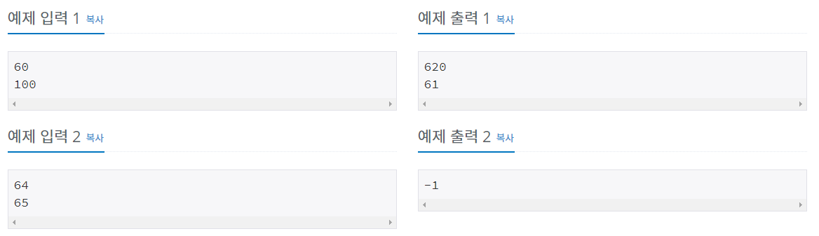 입력의 첫째 줄에 M이, 둘째 줄에 N이 주어진다.