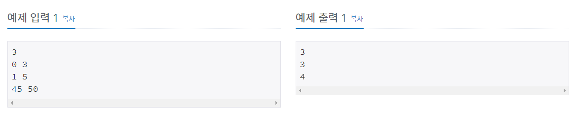 입력의 첫 줄에는 테스트케이스의 개수 T가 주어진다. 각각의 테스트 케이스에 대해 현재 위치 x 와 목표 위치 y 가 정수로 주어지며, x는 항상 y보다 작은 값을 갖는다. (0 ≤ x < y < 231)